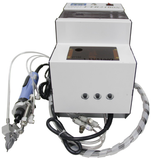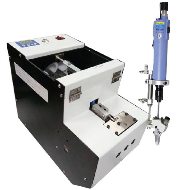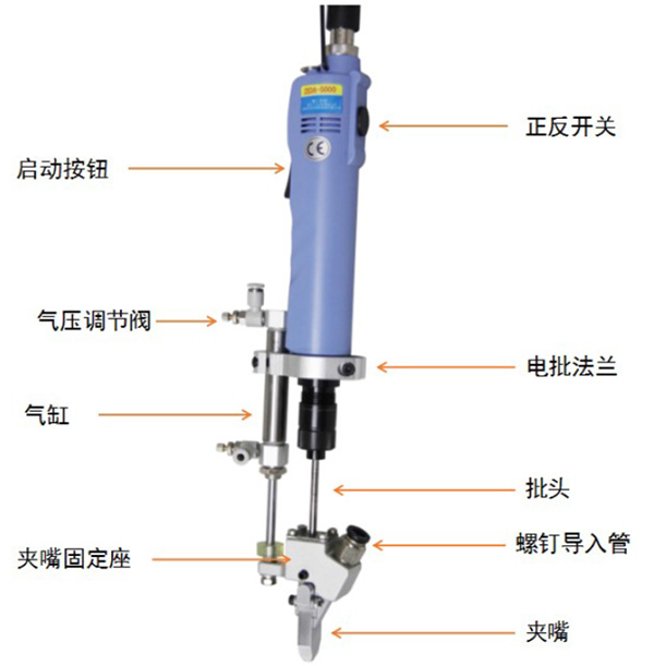 設(shè)備有送料機(jī)構(gòu)、分釘機(jī)構(gòu)、鎖付機(jī)構(gòu)、氣控系統(tǒng)、電控系統(tǒng)組成。螺釘采用自動分料裝置自動排序、分料、送料。工件由操作人員預(yù)組裝定位,然后手持伸縮式電動(或氣動)螺絲刀對準(zhǔn)螺孔位置,下壓螺絲刀,啟動電動(風(fēng)動)馬達(dá),螺絲刀旋轉(zhuǎn)并將螺釘擰緊,達(dá)到設(shè)定扭力后,自動停止;提起螺絲刀,同時有一顆螺釘自動吹送到定位夾嘴中定位。